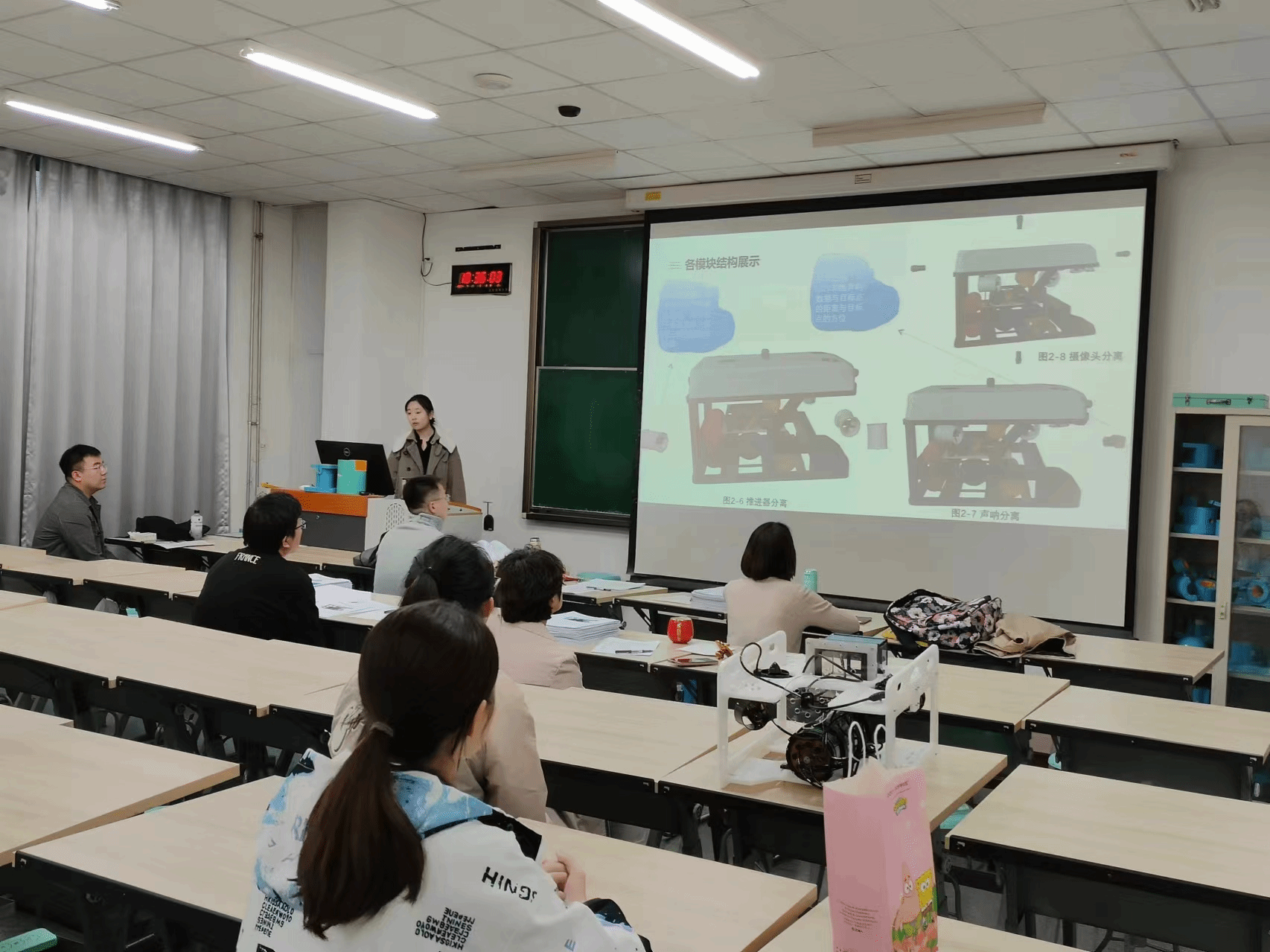 校赛从13:30分开始,持续到19:30分。答辩环节中,各参赛团队代表通过PPT展示汇报,展现团队项目内容及创新特色,评委老师们根据作品的创新性、技术性、美观性和答辩的现场表现,评选出一二三等奖。