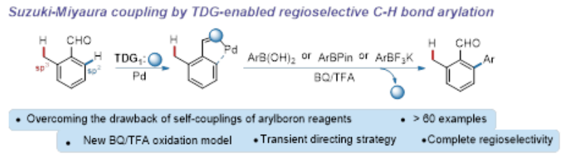 联苯类化合物作为一种重要的结构单元,被广泛应用于医药、有机光伏、有机发光二极管、有机场效应晶体管中。由于芳环C-H键的芳基化反应是合成联苯类化合物最直接有效、环境友好的方法,所以在近年来获得了广泛发展。但是,这些反应都需要使用卤苯作为芳基化试剂,并且往往需要昂贵的银盐作为卤素移除剂,所生成的卤化银会对环境造成一定程度的污染。2006年,余金泉课题组报道了首例芳环C-H键与有机硼化合物的偶联反应。然而,由于芳基硼化合物非常容易发生自偶联反应,导致这种铃木-宫浦型C-H键芳基化反应发展缓慢。