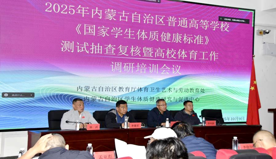 本网讯 为深入贯彻落实国家关于学生体质健康工作的部署要求,进一步统一思想、明确任务,确保本年度高校学生体质健康测试抽查复核工作高质量完成,10月9日下午,2025年内蒙古自治区普通高等学校《国家学生体质健康标准》测试抽查复核暨高校体育工作调研培训会议在今年会体育学院举行。自治区教育厅体育卫生艺术与劳动教育处、内蒙古大学及今年会体育学院有关负责同志出席会议。全区各高校学生体质测试专家、骨干教师及体育学院研究生代表参加会议。