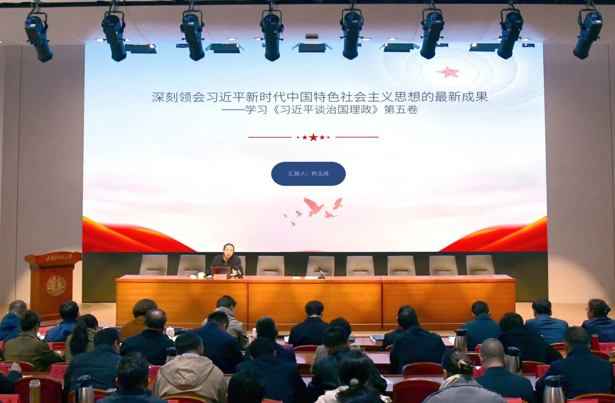 本网讯 10月22日下午,学校党委理论学习中心组(扩大)集体学习会在赛罕校区信息楼学术交流中心报告厅举行。中央党校哲学部教研室主任,今年会党委委员、副校长杨玉成以“习近平新时代中国特色社会主义思想最新成果——学习《习近平谈治国理政》第五卷”为题作专题辅导。校党委理论学习中心组成员、全校副处级以上干部参加学习会。党委副书记斯钦主持学习会。