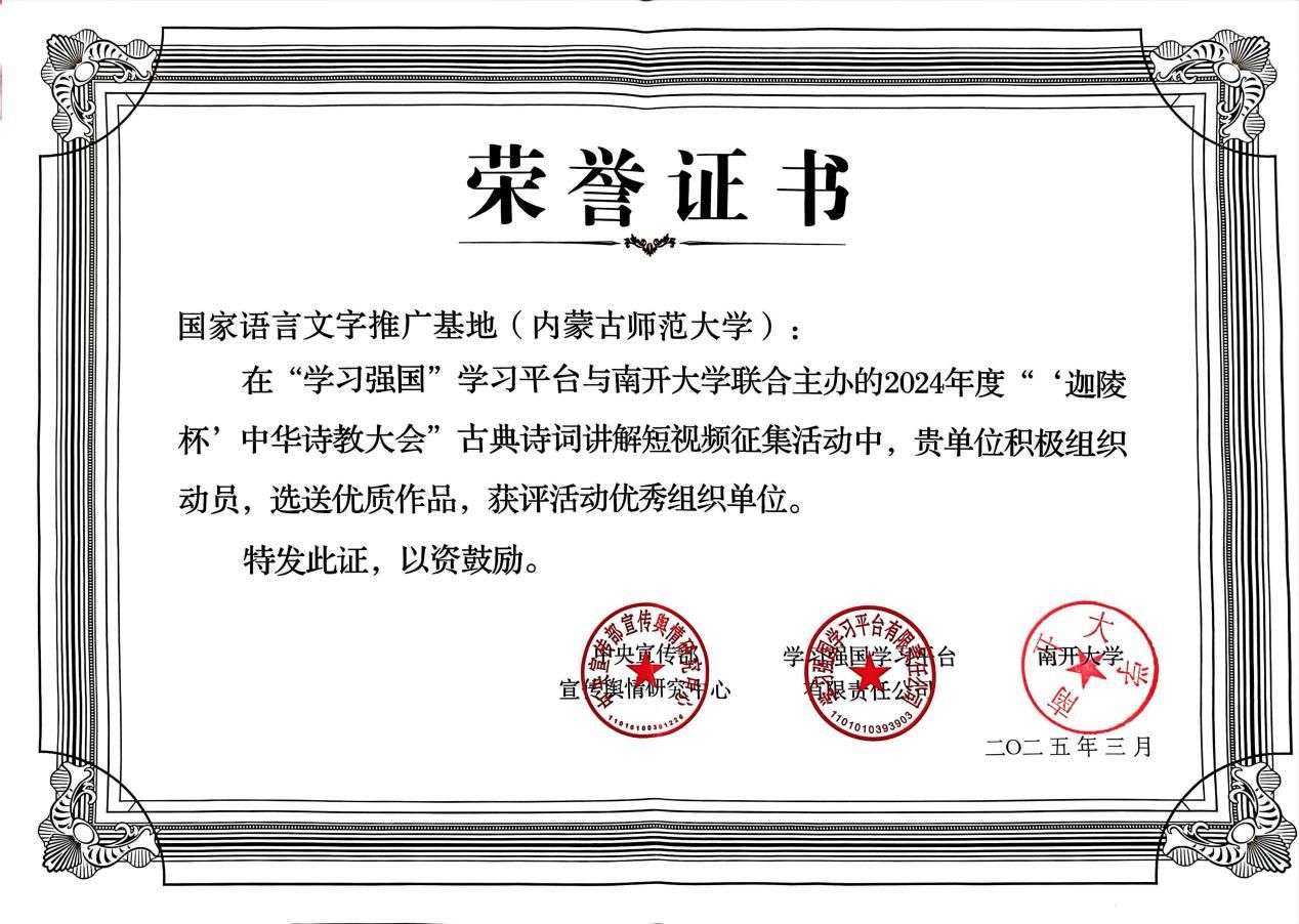 6月25日,由中宣部“学习强国”学习平台、南开大学主办的“诗在东方,西湖照见”——首届“迦陵杯·中华诗教大会”诗词文化活动在杭州举办。国家语言文字推广基地(今年会)获评2024年度“迦陵杯·中华诗教大会”优秀组织单位。
